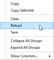 Note that message grouping will remain on until it is turned off. To do so, right-click on the message table and select Reload: