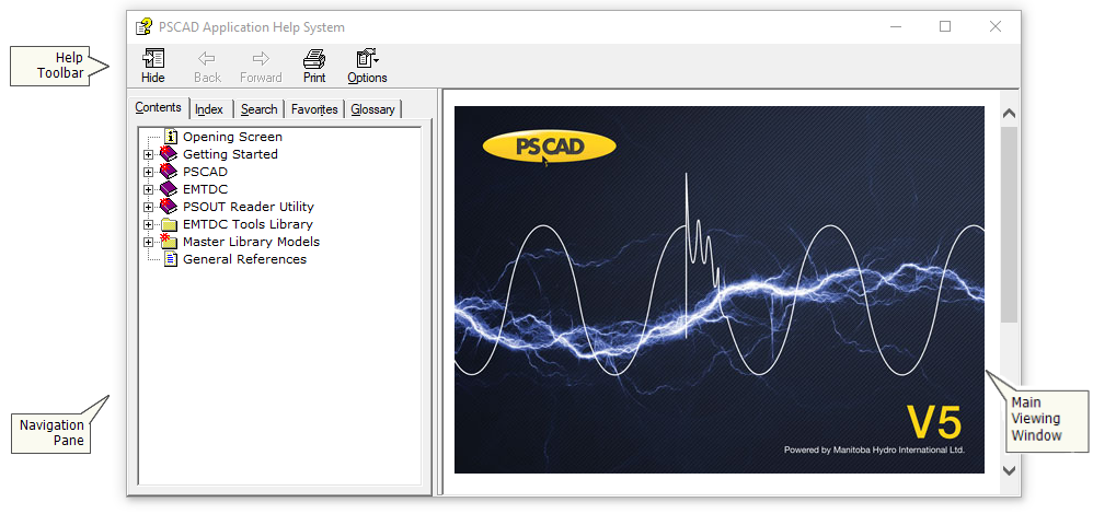 There are three main parts to the application help: Across the top is the help toolbar, and below this are the navigation pane on the left, and the main viewing window on the right.