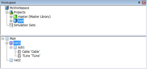 This branch lists all module, transmission line and cable instances in the project. Starting with the main page, modules are organized according to their hierarchy, which helps to simplify navigation, as well as provide a complete overview of how the project is structured. Transmission lines and cables will appear inside their parent module.