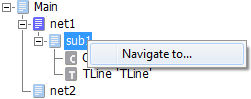 For example, the case project above (with namespace name test) contains a main page with two modules called net1 and net2. The module net1 contains another called sub1. The display format of the names in this branch is adjustable via the option called Namespace in the Workspace category of the Application Options dialog. Depending on the setting of this option, the format is as follows: