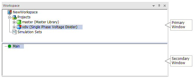 The workspace pane is divided into two sub-windows. The primary window contains a list of loaded projects, and the secondary window context is based on whatever project is selected in the primary window. Its primary function is to provide a navigation tree for ease in jumping from module to module.