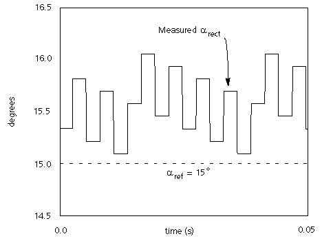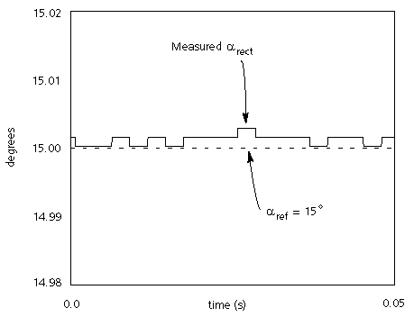 As an example of the application of interpolation, a simple HVDC system, where the differences in measured alpha (at the rectifier) for a constant alpha order is illustrated in Figures 4-4 (a) and (b), with a 50 ms simulation time step. While the interpolated firing produces less than 0.001° fluctuation, the non-interpolated firing results in about 1° fluctuation. Such large fluctuations (of one or more degrees) in firing will introduce non-characteristic harmonics and will prevent fine adjustments in firing angles. In these two examples, EMTDC automatically interpolates the thyristor turn off to the zero crossing (negative) of the thyristor current.