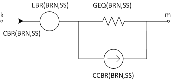 The GEQ interface is virtually identical to the obsolete GDC interface, except that the parameter names and indexing have changed – one of its nodes can be grounded if desired as well. Each parameter is indexed by a branch number directly, thereby enabling the extraction of branch data more easily. The GEQ interface is illustrated below, where BRN represents the branch number and SS is the subsystem number:
