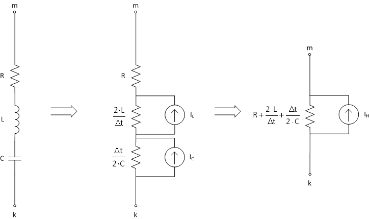 Figure 5-4 – Steps in the Reduction of an RLC Branch Impedance to a Lumped Dommel Equivalent Circuit