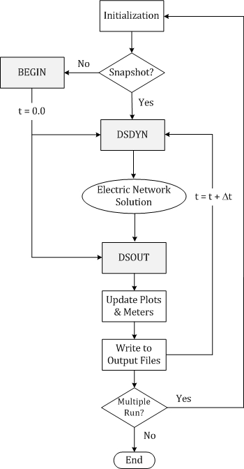 As illustrated by Figure 2-1, the core solution process begins and ends with the system dynamics. First, variables are initialized and stored in BEGIN. Dynamic functions are performed in DSDYN, which includes the preparation of electric network devices such as sources, etc., as well as the manipulation of control signals. The electric network is solved and the resulting measured quantities are considered, along with any post-solution processing requirements, in DSOUT, before the time step is incremented.