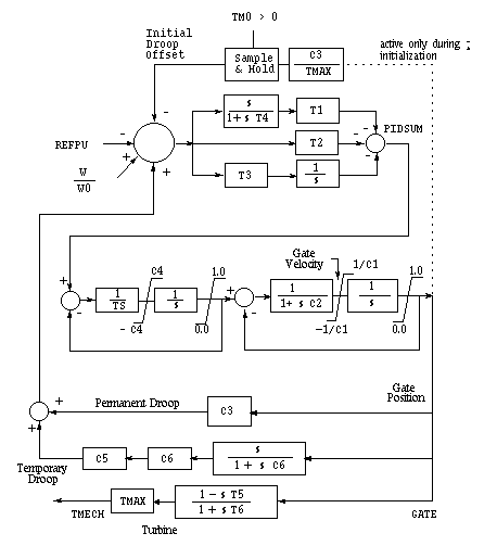 As indicated previously, each of the three hydro governor models have a unique transfer function. The schematic diagram of each is given below.