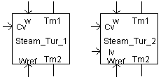 The inputs to this model are per-unit speed w, per-unit speed reference Wref, per-unit control valve position Cv and per-unit intercept valve position Iv from the corresponding Thermal (Steam) Governor. The outputs are the mechanical torques Tm1 and Tm2 and are output from the HP and LP turbines respectively.