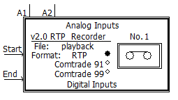 Start and End inputs are provided for control of a specified recording interval. Normally, a simple constant value may be attached to these inputs, however more complicated systems may be used to vary these times during a multiple run simulation. Typical usage is to connect two sliders to these pins and adjust start and stop times in a control panel.