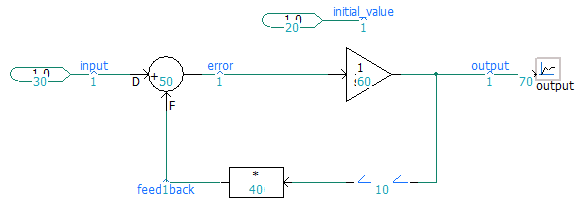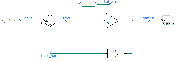 For example, if the feedback loop selector in Figure D above is initialized to a value of 1.0 at time zero, then the error signal will be calculated as 0.0 (error = input - feed_back). The output signal will now remain a 1.0 throughout the simulation.