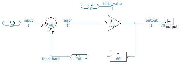 Figure B shows the sequence numbers assigned automatically by the sequencing algorithm. These numbers represent the order in which these components will appear in the system dynamics code. For example, the output of the integrator component is calculated following the output of the summing junction, and so on. The signal called initial_value will be the first to appear in the generated code because it has the smallest sequence number on this schematic canvas. This signal is used as an input parameter to the integrator component, to provide it with an initial output value. Thus, the input of the gain component will eventually be set to 1.0, as its sequence number (50) directly follows the calculation for the integrator (40).