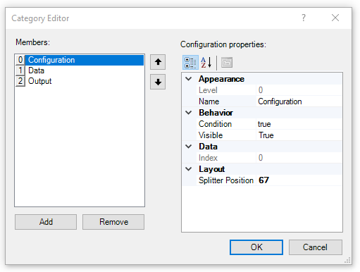 Condition: Enter a expression (optional) to determine under what input conditions the category is to be enabled (the default is true). If a category is disabled, the user will still be able to view the contents, but all input fields within it will be disabled. See Expressions Statements and Operators for more details.