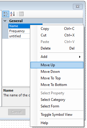 Form properties can be adjusted by first left-clicking anywhere on the WYSIWYG display frame. The frame properties will appear in the properties form:
