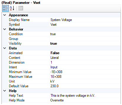 A designer wants to convert an parameter with Symbol property name Vset in kV, to a per-unit value called SetPU, before it is used in component Fortran code. An additional parameter with symbol property name Vbase in kV has also been defined for the system voltage base.
