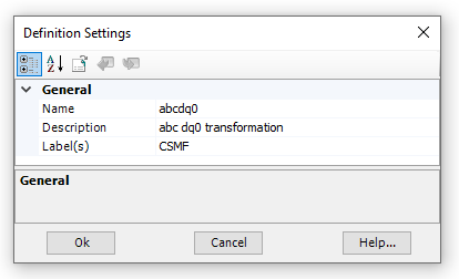 NOTE: Library pop-up menu systems will include all libraries currently loaded in the workspace. The organization of definitions in this menu is accomplished by using the Label definition property. For example, the abc to dq0 Transformation component in the master library will appear under the CSMF sub-menu above. The definition settings are set as follows: