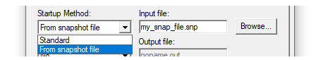 Open the Project Settings dialog window as described in Editing Project Settings. In the Runtime section of the dialog, choose From snapshot file in the Startup method drop list. Enter a name for the snapshot file in the Input File field or use the Browse... button to select the file.