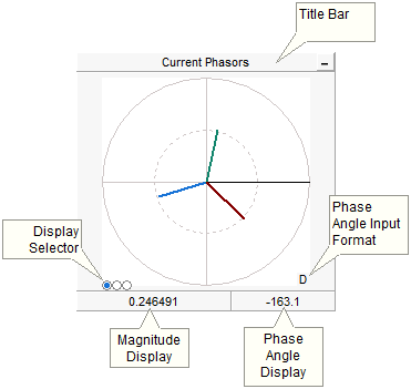 A PhasorMeter is a special runtime object that can be used to display up to six, separate phasor quantities. The phasormeter displays phasors in a polar graph, where the magnitude and phase of each phasor responds dynamically during a simulation run. This device is perfect for visually representing phasor quantities, such as output from the Fast Fourier Transform (FFT) component.