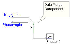 To display a single phasor quantity, the user must construct an array data signal of dimension two, using the Data Merge component. The two data signals will represent the magnitude and phase angle respectively. To this array signal, an Output Channel is attached as shown below: