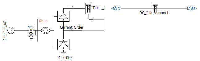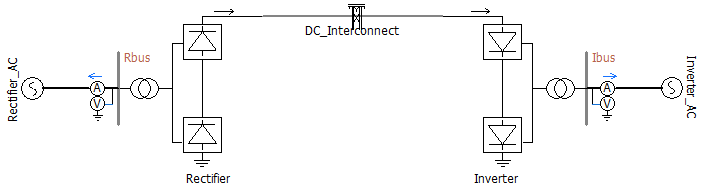The boundaries of electric subsystems in EMTDC are defined via distributed-parameter transmission lines and cables, and so it makes sense that the transmission segments themselves be the linking points in a multi-project simulation. As a very simple example, let us take a slightly modified version of the familiar Cigre Benchmark Model example project. A transmission line has been added to represent the DC interconnection between the two converters (the original was simply an RLC passive network).