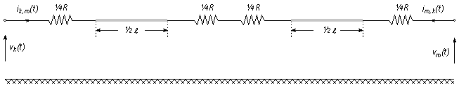 The breaking of the system into two sections, along with the additional resistance elements, results in a change in the Norton representation of the loss-less line shown in Figure 8-33. The equivalent circuit of a loss-less line with lumped line resistance is given below: