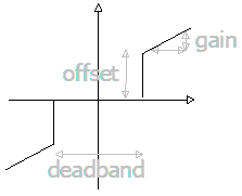 This component models a deadband controller. If the input is within a defined range, the output will be zero. If the input is more than the positive half of the range, the output will increase with the defined offset and gain. If the input is below the negative half of the range, the output will decrease with the negative offset and negative gain.