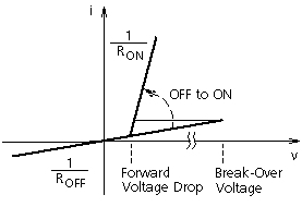 The thyristor assumes a fixed small ON and a large OFF resistance. The thyristor state will change under the following conditions: