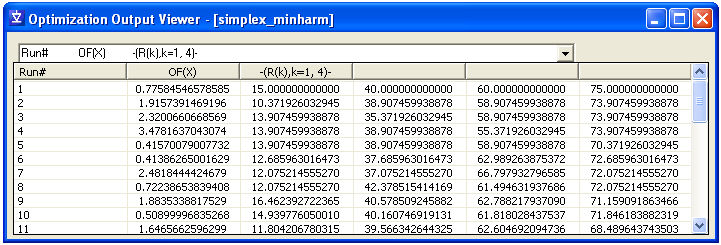 Where Run# is the run number, OF(X) is the Object Function value and R(k) are the output variables being optimized.