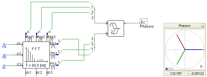 This component interlaces two signal vectors (arrays) into a combined output array. This component is especially useful for combining an array of polar magnitudes with an array of polar phase angles, so that they are formatted for direct input to a PhasorMeter. For example, consider the following where output from the On-Line Frequency Scanner (FFT) is formatted for display:
