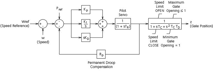 As indicated previously, each of the three hydro governor models have a unique transfer function. The schematic diagram of each is given below.