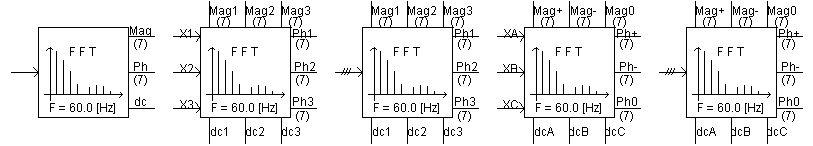 +/-/0 seq: This takes a 3-phase input XA, XB, XC and calculates the FFT preliminary output through a sequencer, which outputs positive (+), negative (-), and zero-sequence magnitude and phase components of the fundamental, and each harmonic. The DC components of each phase are also output.