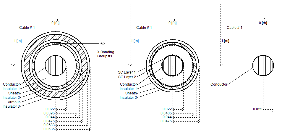 This cable is defined be a centre solid conductor, and can have up to three concentric conductors about the centre. Each conductor is separated by an insulator. The cable cross-section is used to define the geometric position and the conductor/insulator properties of the cable system within the Transmission Segment Definition Editor.