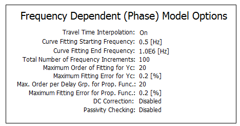 For most studies, the default parameters are suitable. The user should always check the log file, as it will show any warnings and errors produced by the line constants program, and will also indicate the final accuracy of the curve fitting process.