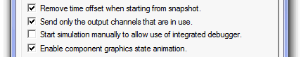 Selecting this option will turn off all output channels that are not being plotted in graphs, or monitored in meters. Enabling this option has the potential to greatly reduce the amount of storage for the simulation, as well as a slight simulation speed improvement.