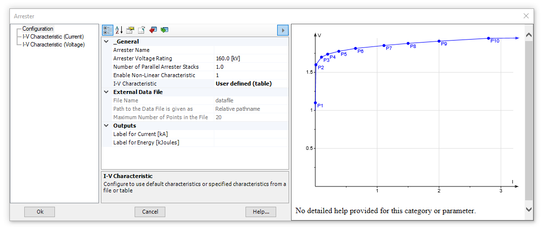 As shown above, several of the master library components have been enhanced to provide relevant visual aid through their individual Dynamic Help Windows. The contents of the dynamic help window are fully dynamic (hence it's name). For example, any changes made to the arrestor I-V characteristic data in the parameter form, will immediately be reflected in the dynamic help window.