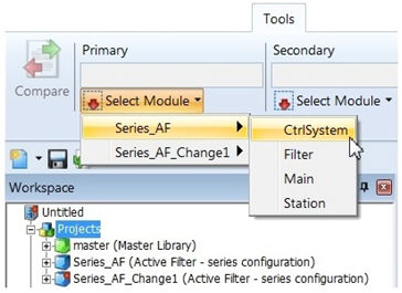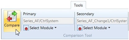 The controls for the module comparison tool may be found in the Tools tab of the ribbon control bar. At least one project must be loaded in the workspace before proceeding. To compare two module definitions: