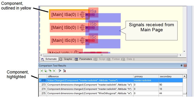 The results shown in the Schematic view are synchronized with those given in the Comparison Tool Results pane. Simply click a row in the results table to highlight the result in the Schematic view. Alternatively, select a difference in Schematic view to highlight the corresponding row in the Comparison Tool Results pane.