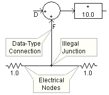 It is important to note the difference between an electrical and a data signal when connecting components together. Wires may be used interchangeably as data signal paths, or for connecting electrical nodes. However, it is illegal to connect data signals to/from electrical nodes. For example, the following connection is invalid: