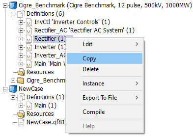 To copy a module definition with its dependents from one project to another: Select the source project in the workspace primary window and expand the definitions branch. Right-click on the definition and select Copy from the popup menu.