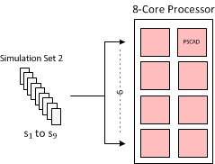 The image below illustrates a scenario on how resources are utilized when running simulations in sets. In this example, there are two sets, one containing 5 simulations, and the other 9. As the local processor is 8-core, then there are 7 cores available (one used by PSCAD) to run the processes. The second set contains more simulations than there are cores available (9 simulations, 7 cores). In these situations, the operating system will force all 9 processes to be shared amongst the available resources. Obviously, the more cores available for parallel processing, the larger the sets of simulations can be run without any impact on efficiency.