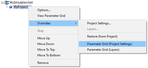 Managing simulation and simulation set options can become unruly when many simulation sets are defined in the workspace. Thankfully, the Parameter Grid may be utilized for these tasks. Simulation set options, simulation options, simulation project setting overrides, and simulation layer overrides, may all be managed through the parameter grid: