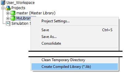 When the Create Compiled Library (*.lib) function is invoked, PSCAD will create a temporary folder for the library project located in the same directory as the project (*.pslx) file. In it will be placed the compiled library file (*.lib), plus an individual object file (*.obj) for each linked source file.