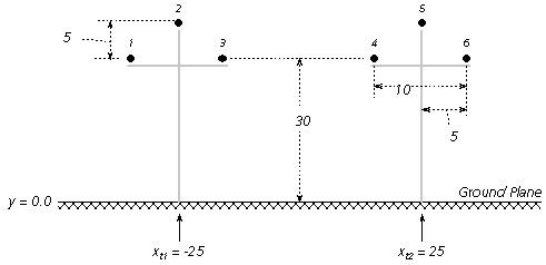 For example, the system in Figure 8-3 consists of two towers and six conductors. A set of xy coordinates for each conductor is derived given the tower input data so that (assuming both towers are structurally identical):