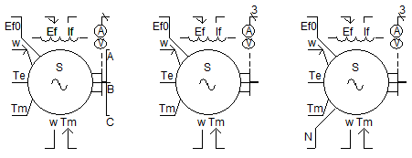 This component includes an option to model two damper windings in the Q-axis and hence, it can be used as either a round rotor machine or a salient pole machine. The speed of the machine may be controlled directly by inputting a positive value into the w input of the machine, or a mechanical torque may be applied to the Tm input.