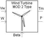 This component models the simple mechanical physics of a wind turbine, considering blade configuration (2 or 3 blade), tip speed ratio, coefficient of power, and blade sweep area and radius. Shaft dynamics are not considered in this model and it may be used together with the wind governor model. Wind speed Vw and the mechanical speed of the machine connected to the turbine W are the inputs. Beta is the pitch angle of the turbine blades and is entered in degrees. Tm and P are the output torque and power respectively in per-unit, based on the machine rating.