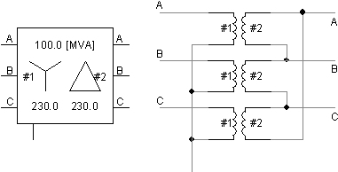 This component is the equivalent of three, 1-Phase, 2-Winding Transformers connected in a 3-phase bank, where the user can select the winding interconnections to be Y or D on either side. Inter-phase coupling is not represented in the classical transformer models. An equivalent circuit is shown below, using 1-phase transformers: