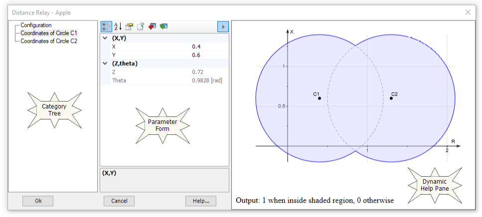 The Parameters section is used to design the primary interface between the user and the component. This is accomplished through the use of programmable dialogues know as Categories, into which users may input everything from model parameters to model conditions and appearance, and also extract output.