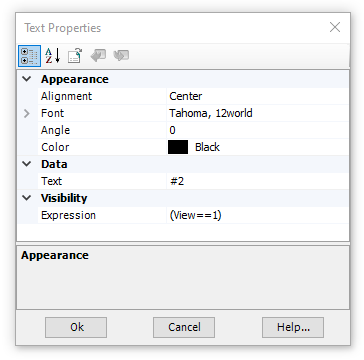 Text label properties can be adjusted through the Text Properties dialog: Either left double-click or right-click over the text label and select Properties....