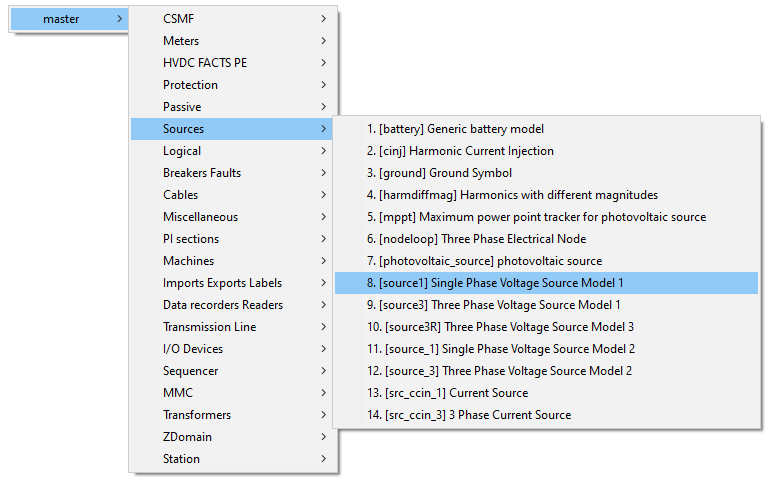 NOTE: Library pop-up menu systems will include all libraries currently loaded in the workspace. The organization of definitions in this menu is accomplished by using the Label definition property. For example, the abc to dq0 Transformation component in the master library will appear under the CSMF sub-menu above. The definition settings are set as follows: