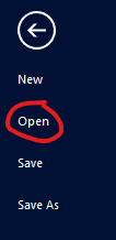 Click the File tab in the ribbon control bar, click the Open menu item, and then select the Open icon.