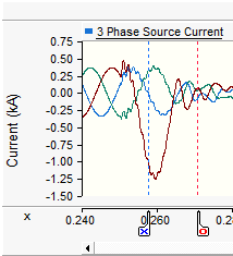If only a fraction of the total graph frame time scale is currently being viewed in a graph, the markers may appear outside the viewing frame when they are first enabled. If this happens, blue and red arrow symbols will appear on the time axis indicating the markers are set off the screen.