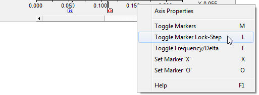 Once the markers are enabled, you can conveniently invert the time axis difference between them to display corresponding frequency. Left double-click the graph frame horizontal axis, or right-click over the horizontal axis and select Toggle Frequency/Delta (or press the F key on your keyboard):